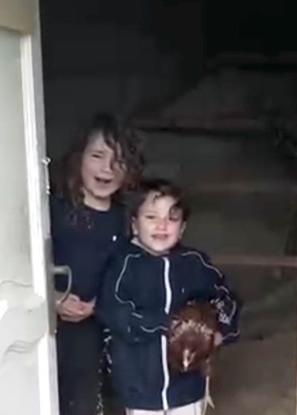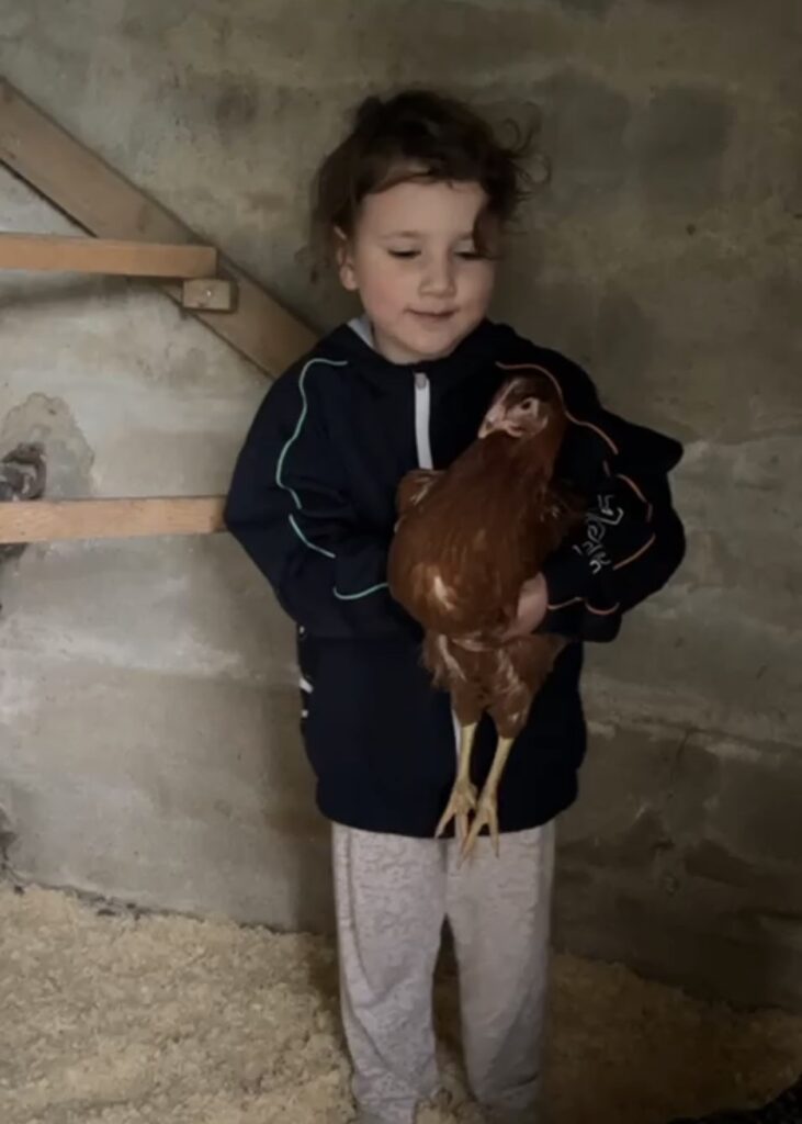 Too afraid to catch the chicken herself, she lifted Gabriel onto her shoulders he grabbed his chicken to safety.