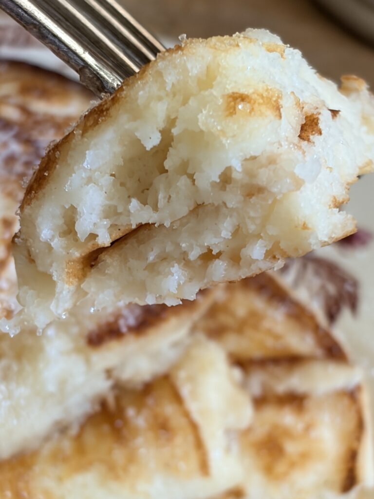 The batter is thick—very thick. It kind of bloops onto the grill. There are a few lumps, but not many. Grill them with salted butter. When bubbles form on top and start to pop, I flip—only once.