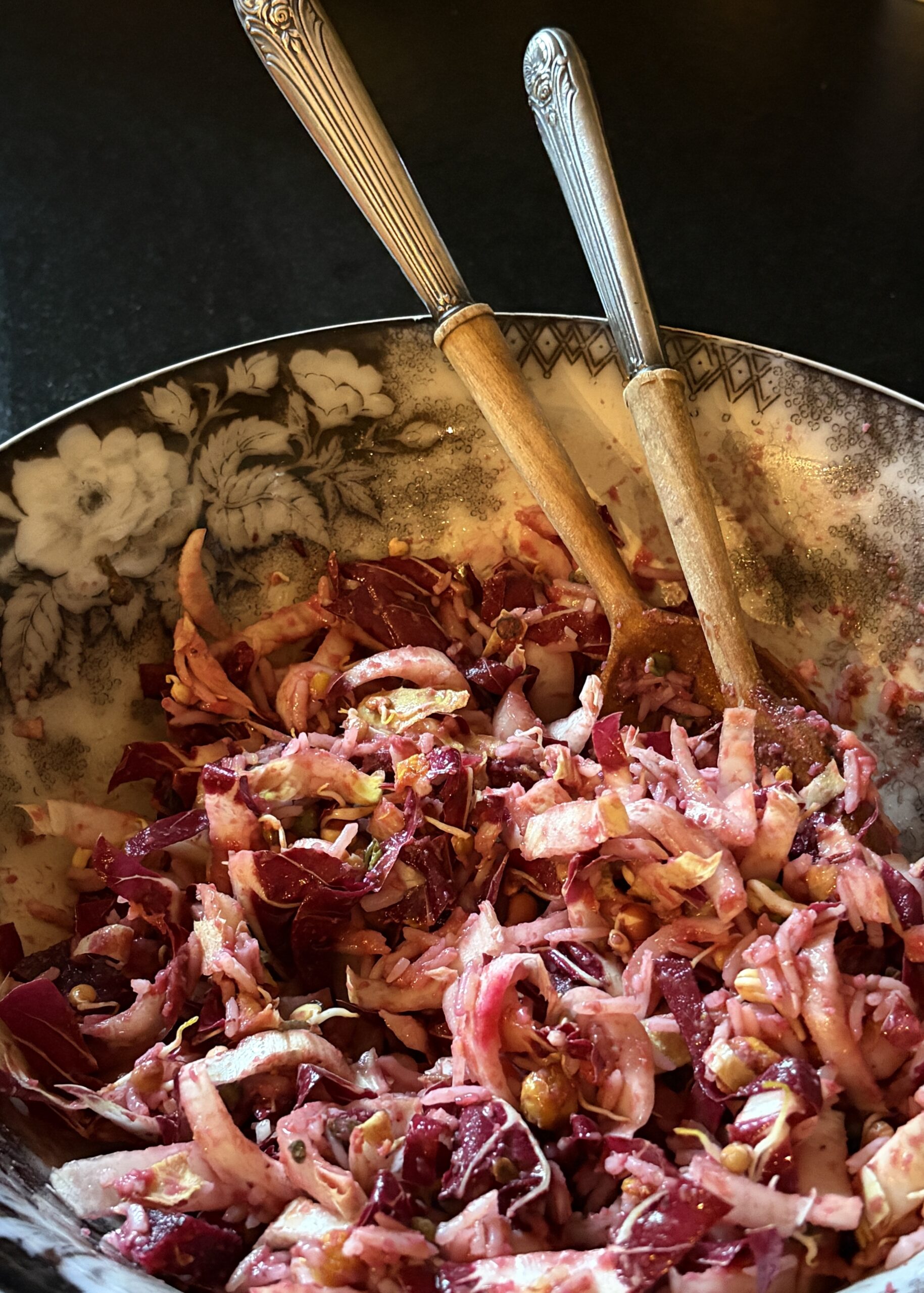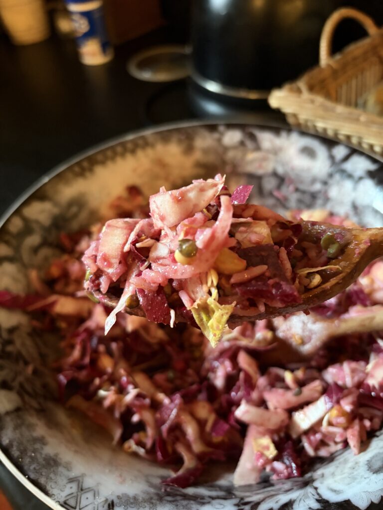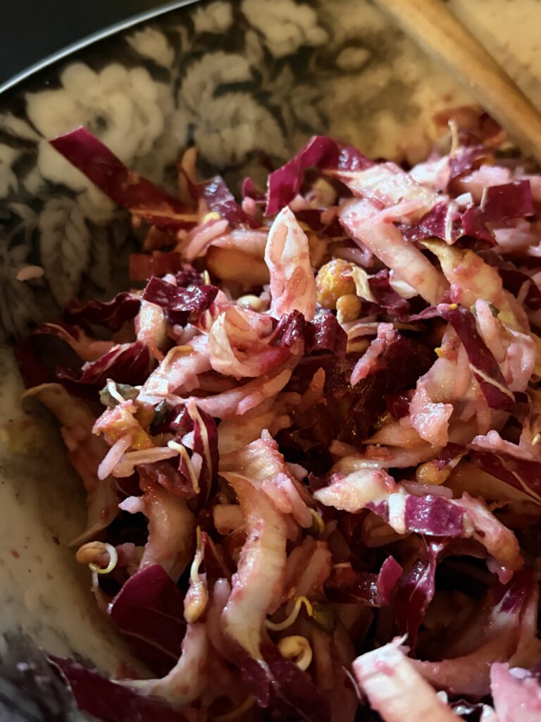 Take a red chicory and an endive and tight, slice them thinly toss into a salad bowl and invite a cup of cooked rice, scatter a handful of pomegranate seeds, half of a freshly cooked beet (the other half will come later), hearty handful of sprouted beans, sprinkle a couple of teaspoons of brewers yeast, of course some capers to add some tang to the party.